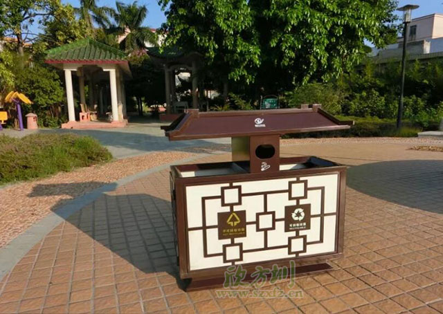 最近剛接到廣西桂林市的市容園林局來電,詢問適合放在街道兩邊的垃圾桶,相關(guān)負責人稱,為了提升一二類道路的形象,要求款式特別一點,經(jīng)我們的推薦,客戶再三挑選,最終選中了我們欣方圳垃圾桶廠家精心設(shè)計定做的這款中國風分類垃圾桶,就是以下這款款式新穎典雅的復(fù)古中國風垃圾桶,鋼制垃圾桶雖是藏污納垢之處,但也體現(xiàn)了一個城市的形象,這樣有設(shè)計感的戶外垃圾桶確實很有特色。更環(huán)保安全呢!