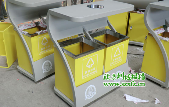 海南省??谑?a href="http://www.beijiuzhouymca.com/product_26.html">鋼制垃圾桶,是按照顧客的圖紙要求來制作。垃圾桶頂部弧形設計,呈現愛心形狀,用來防止雨水傾入內桶。左右兩桶,采用黃顏色噴漆,內桶充分利用空間。簡約搭配,巧妙的設計,多了一份有特色,有創意,有內涵!