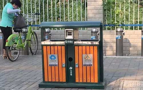 在澮水路、淮河路等路段看到,街道兩旁都設(shè)有垃圾分類箱,每隔百十米就能看到一個,這些垃圾箱左右兩邊的箱體表面均有綠色“可回收物”和黃色“其它垃圾”的標(biāo)識,“可回收物”下面標(biāo)志著紙類、玻璃、金屬、塑料等,“其它垃圾”的下面標(biāo)志著果皮、樹葉、食品殘留、灰土等。垃圾箱的頂部中間位置設(shè)有“投煙處”和“有害物”等。