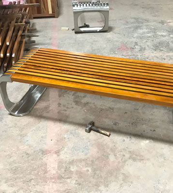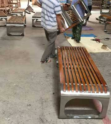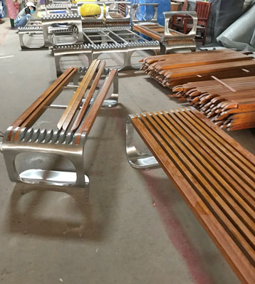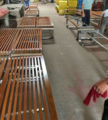 欣方圳不銹鋼室外休閑椅凳面防腐木材質制作流程示意圖,工藝領先,品質卓越,真正經久耐用。
